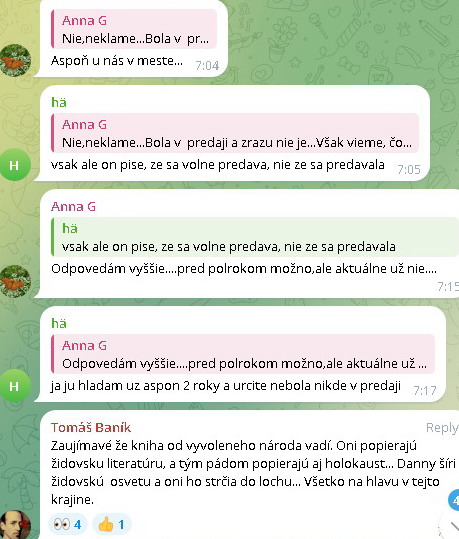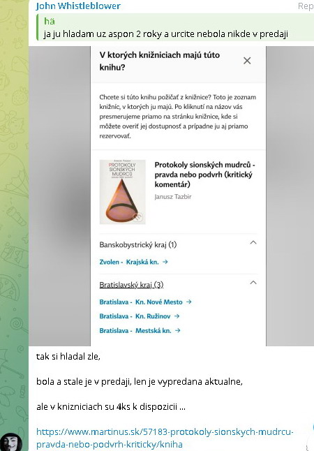 A áno, ako som písal už predtým, Protokoly sú dostupné v knižniciach, tak isto ako iné historické dokumenty. Keby si jeho fans dali námahu, tak by našli viac antisemitské dokumenty a publikácie v knižniciach. Lenže tieto dokumenty sú požičiavané na študijné účely, takisto v antikvariátoch a keď sú na predaj, tak je uvedené, že predávaná kniha slúži len na študijne účely, nie na účely propagácie. Ale keď ich zdieľate verejne a píšete pri tom o vešaní nosatých tak tomu, že je to za účelom vzdelávania, uverí fakt len tupec pre ktorého je Bombic vzor. Nehovoriac že niekto uverí, že Daniel nosatými myslel Britov, ktorí do všetkého pchajú nos.