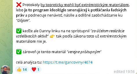 Poďme najprv k toľko spomínaným Protokolom. Na Slovensku okrem pôvodného vydania z roku 1939, boli u nás vydané pod názvom Kniežatá Zloby v roku 1991 vo vydavateľstve Agres. Vydavateľ Judr. Šavel bol súdený pre antisemitizmus. V Čechách vyšli Protokoly tiež v roku 1991, v neznámom vydavateľstve Gabriel a následne boli vydané v roku 2015 vo vydavateľstve ABB Adama Bartoša, ktorý bol čuduj sa svete tiež súdený za antisemitizmus a následne mu boli zabavené knihy vydané jeho vydavateľstvom teda aj protokoly. A hneď tu máme dvakrát potvrdené, že šírenie antisemitských pamfletov je trestné. Nehovoriac už o tom, že doteraz ani jeden z Bombicových obhajovateľov nedokázal potvrdiť pravdivosť informácie, že sa Protokoly predávali v Martinuse a Panta-rhei, teda vlastne sa stále predávajú, lebo oni nám stále tvrdia že sa dajú bežne kúpiť v spomínaných kníhkupectvách. Toto klamstvo si môže ľahko overiť každý zmýšľajúci človek, okrem Bombicových fans. Tým stačí, že Daniel povie, že to tak je.